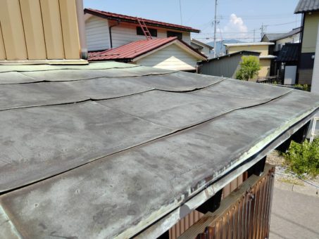 屋根からの落雪でくぼんだ銅板の隙間から水が侵入し腐食して穴が開いて屋根部分は全替えした例です。